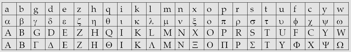 Folgende Tabelle zeigt die Zuordnung der lateinischen Tasten in der üblichen deutschen Tastaturbelegung zu den griechischen Klein- und Großbuchstaben unter Nutzung eines lateinischen Zeichensatzes und des Zeichensatzes "Symbol" (2. und 4. Reihe, hier natürlich durch html-code vertreten, also "alpha" im code = "α" etc. [Näheres hierzu siehe SelfHtml]):
